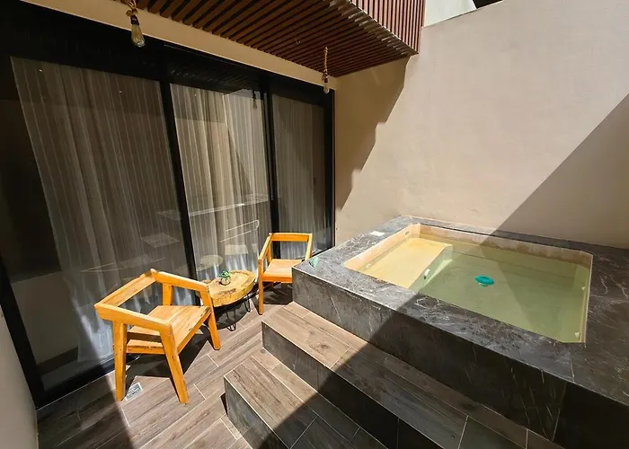 Chic Studio Private Pool & Beach Club Access Tulum ligger i distriktet La Veleta, ungefär 25 minuters gångavstånd från kulturella sevärdheter som Cenote Cristal. Gästerna kan utforska området tack vare cykeluthyrning som finns på plats.